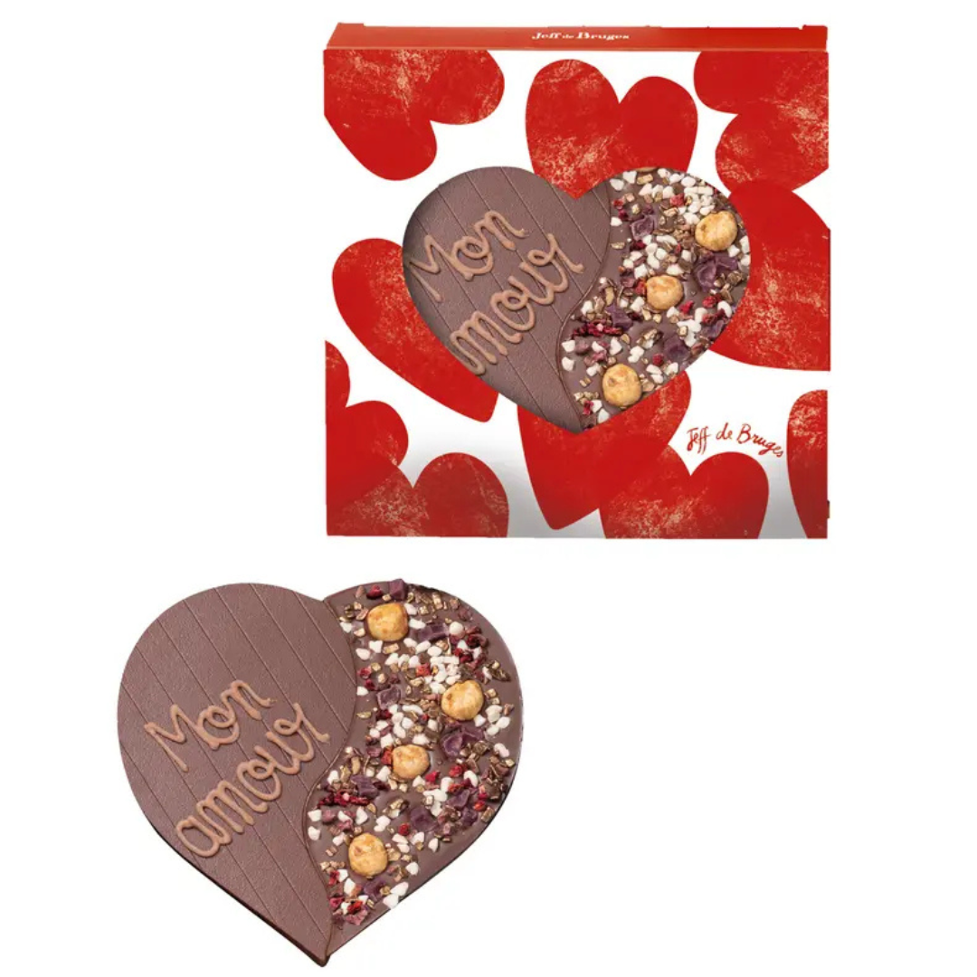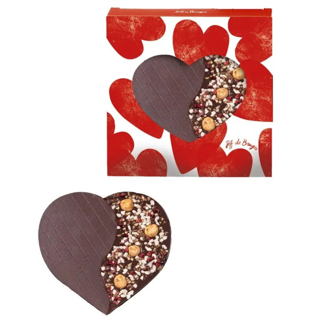 CŒUR DE CHOCOLAT AU LAIT DÉCORÉ DE NOISETTES ENTIÈRESCARAMELISÉES, PÉPITES DE PECTINE À LA MYRTILLE, NOUGAT, PAILLETTESDE CHOCOLAT BRONZE ET FRAMBOISES DÉSHYDRATÉES LYOPHILISÉES.