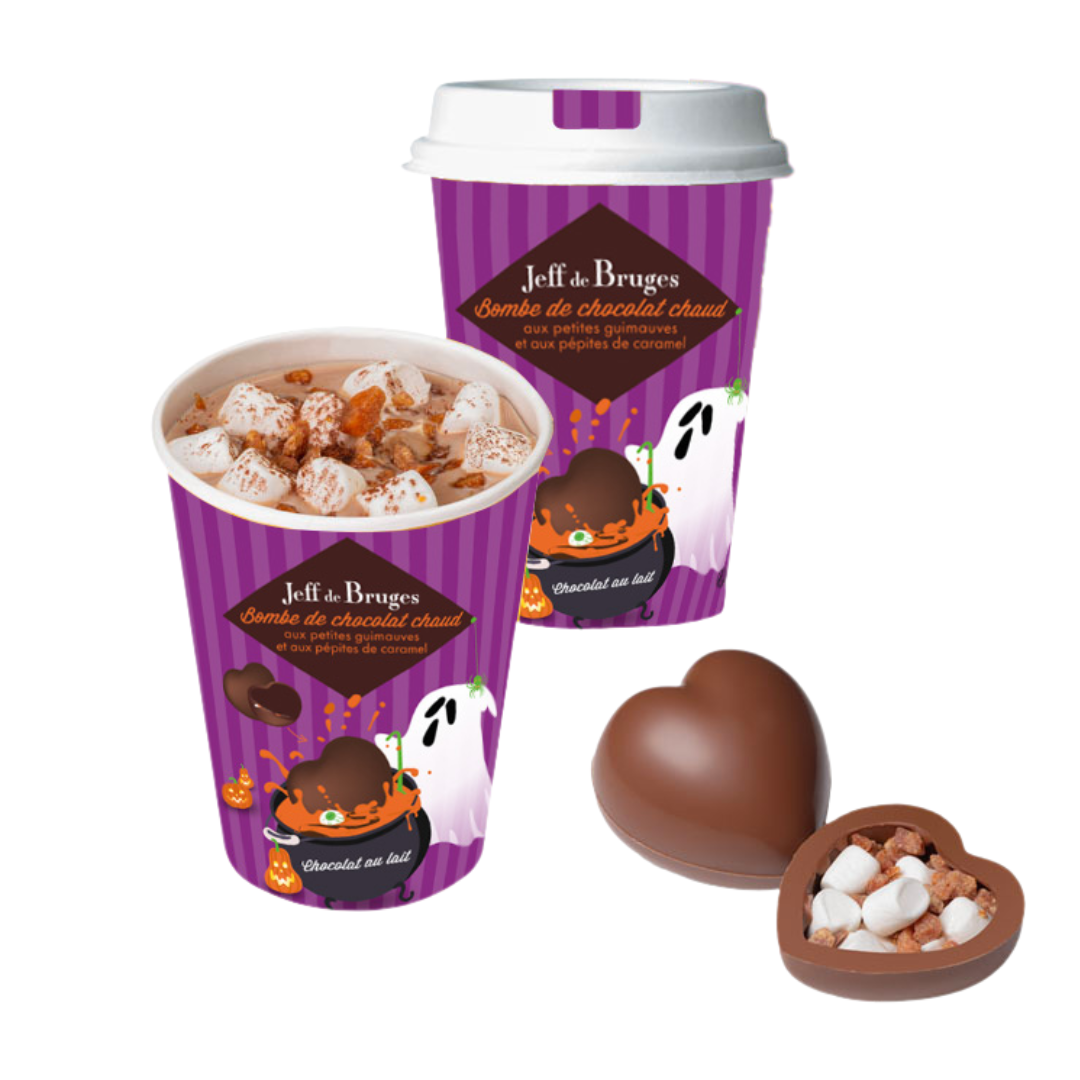 Pour Halloween nos bombes caramel changent de look !Après le succès de la bombe chocolat noir…. S! Une recette fondante et gourmande avec des pépites de caramel, pour un chocolat chaud surprenant ! Les petites guimauves apporteront plus de texture et d’onctuosité à cette succulente boisson chaude.