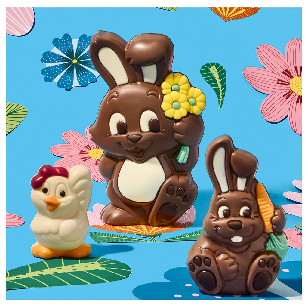 Les animaux de Pâques en chocolat sont un incontournable pour une chasse aux oeufs mémorable ! Marcel, le charmant coq est prêt pour la chasse aux oeufs. Ce sujet en chocolat au lait accompagné de ses petits chocolats fourrés, fera un beau cadeau pour petits et grands.