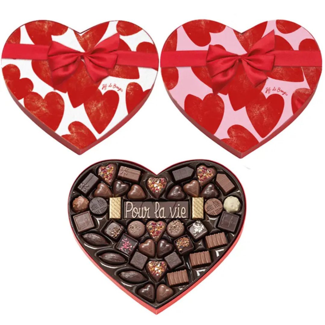 Cœurs éclats et Cœurs JB – chocolat au lait et chocolat noir assortis. Ingrédients : chocolat au lait (sucre, beurre de cacao, masse de cacao (fèves de cacao origine Équateur), LAIT entier en poudre, LAIT écrémé en poudre, émulsifiant : lécithines (SOJA), arôme naturel de vanille), chocolat noir (masse de cacao (fèves de cacao origine Équateur), sucre, matière grasse laitière (LAIT), beurre concentré (LAIT), beurre de cacao, émulsifiant : lécithines (SOJA), arôme naturel de vanille), pâte de NOISETTES, sucre, NOISETTES torréfiées et concassées, paillettes chocolat bronze (sucre, pâte de cacao, LAIT écrémé en poudre, agents d’enrobage : shellac et gomme arabique, émulsifiant : lécithine, colorants : oxyde et hydroxyde de fer), pâte de cacao, crumble (farine de BLÉ, sucre, beurre (LAIT), sel), crème (LAIT), humectant : glycérol, fruit de la passion, LAIT entier en poudre, beurre de karité, matière grasse de noix de coco, sirop de glucose, huile de tournesol, beurre concentré (LAIT), granules de meringue (sucre, blanc d’OEUF, amidon de maïs), pépites à la framboise (sucre, jus de framboise à base de concentré, dextrose, jus de citron à base de concentré, gélifiant : pectine, arôme naturel, colorant : concentré de carotte noire), AMANDES, LAIT écrémé, sirop de sucre inverti, groseilles lyophilisées, framboise déshydratée et lyophilisée, arômes naturels de vanille, de violette et de miel), miel, fleurs de violette odorante, sucre candi, NOISETTES, sirop de sucre, cacao maigre en poudre, cannelle, émulsifiant : lécithines (SOJA), concentré de pomme, concentré de groseilles noires, concentré de citron, concentré de radis, extrait de spiruline, agent d’enrobage : gomme arabique, correcteur d’acidité : acide citrique. Peuvent contenir des traces d’autres céréales contenant du gluten, d’œufs, de graines de sésame, d’autres fruits à coque et d’arachides.