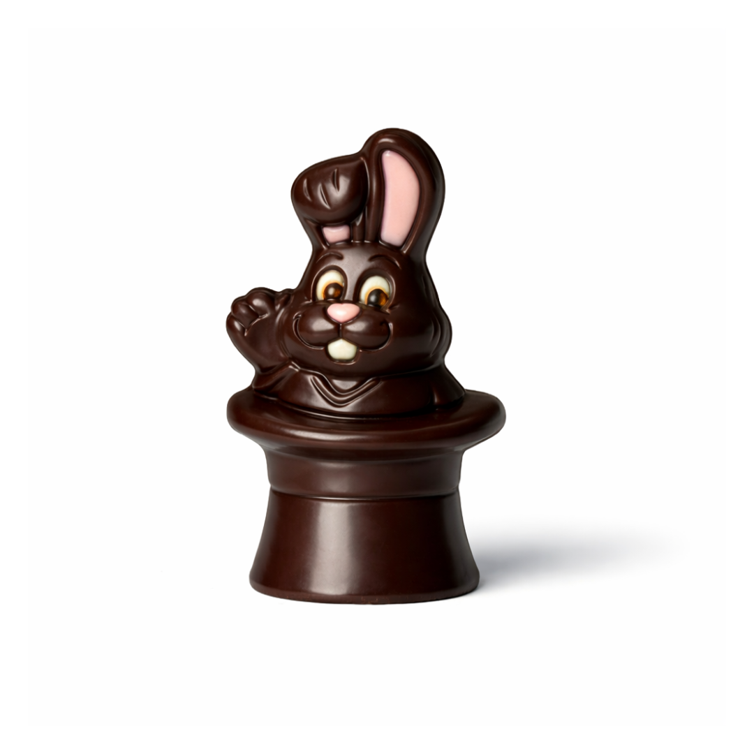 Ce grand sujet en chocolat noir, accompagné de ses petits chocolats fourrés, fera un beau cadeau à déguster seul ou en famille.