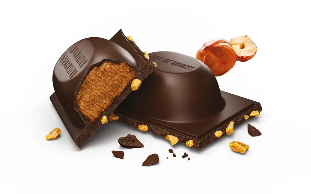 CHOCOLAT NOIR 60% CACAO, PRALINÉ NOISETTES ET ÉCLATS DE NOISETTESCARAMÉLISÉES 3%